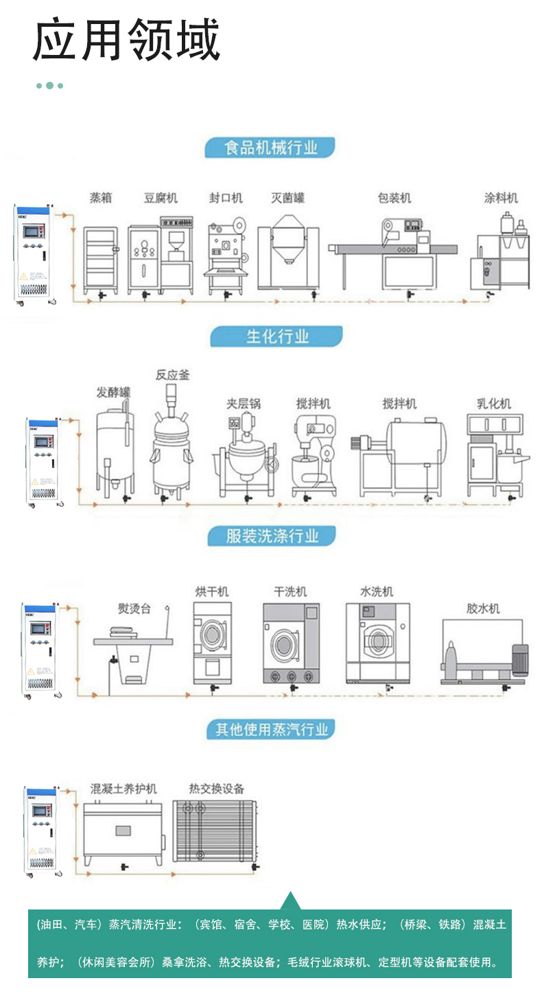 應用領(lǐng)域:食品機械行業(yè)、生化行業(yè)、服裝洗滌行業(yè)、其他使用蒸汽行業(yè)等。